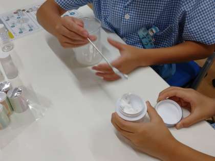 グループごとで材料を混ぜて、日焼け止めクリームが完成しました。一人一人、容器に入れました。