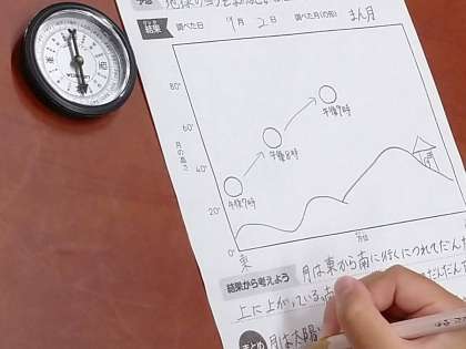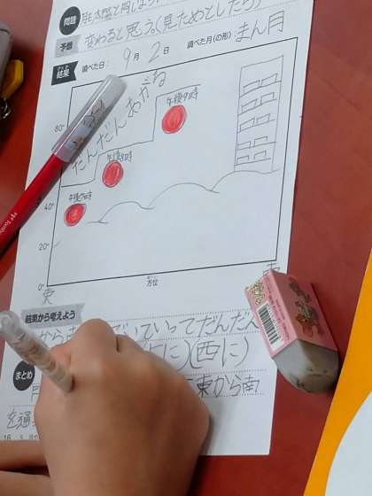 【4年生 理科】 公開日 2024/09/02 更新日 2024/09/02 4年生 月の動きについて学習しました。月は太陽と同じように… 子どもたちはていねいに図を書いて、大事なポイントを押さえて、プリントにまとめることができました。 暑いですが、実はもう9月。お月見の季節ですね。お家でも月を見る機会があれば、今日の学習を思い出しましょう。 いいね(0)