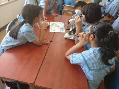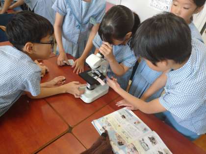 【5年生 理科】 公開日 2024/09/06 更新日 2024/09/06 5年生 顕微鏡を使って、いろいろな植物の花粉を観察しました。 ヘチマ、キュウリ、ヒマワリ、運動場に咲いていた紫色の花などなど。種類によって、花粉の形は全然ちがいます。 子どもたちは、ピントをうまく調節しながら、形のちがいを観察することができました。 いいね(0)