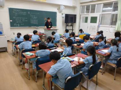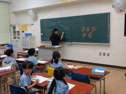 教育実習生が授業をしました。かけ算の求め方を考える学習です。1皿に3このどら焼きが5皿分。子どもたちはおはじきを使ったり、図を書いたりして答えを求めていました。