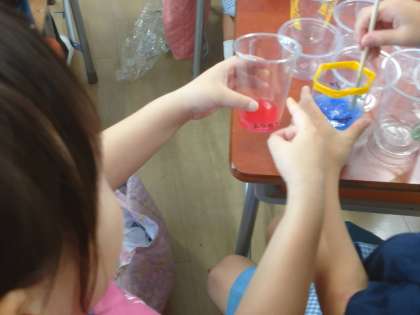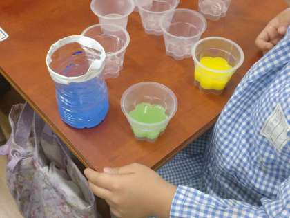 「いろみずあそびをしよう」コップに水を入れて、絵の具を1色だけ溶かして、色水を作りました。そして、周りの友だちと色水を混ぜて、新たな色がついた水を作りました。