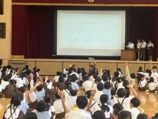 校舎内の水道の数や1年生の人数などが問題でしたが、一問一問、正解が発表されるたびに大歓声が上がっていました。講堂にあるバスケットボールの数を聞かれたときは、隅にあるバスケットボールの数を遠くから一生懸命数えていた姿が印象的でした。