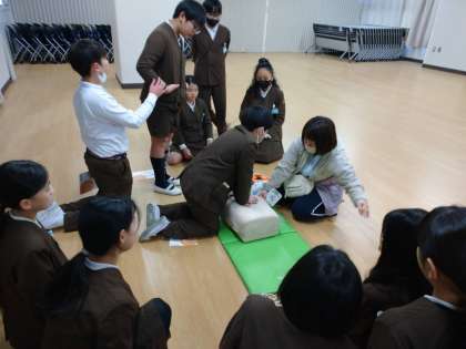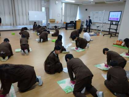 胸骨圧迫(心臓マッサージ)は止まってしまった心臓をポンプのように動かせるために、かなりの力で胸を押し下げ、そのあと胸が上に戻るように引かなければなりません。5年生は、体験してみて初めて分かるコツを教わり、練習を重ねていました。