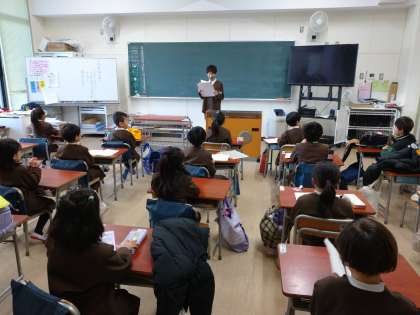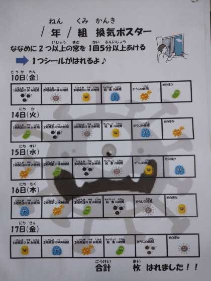 クラスでは、しっかり換気を、児童個人は手洗いを行い、学校全体で病気を予防します。安心・安全・健康委員が各クラスに伝えに行き、ポスターやカードが配られました。