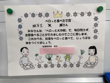 職員室でもペロッと食べることができたので、給食委員会から賞状をいただきました。