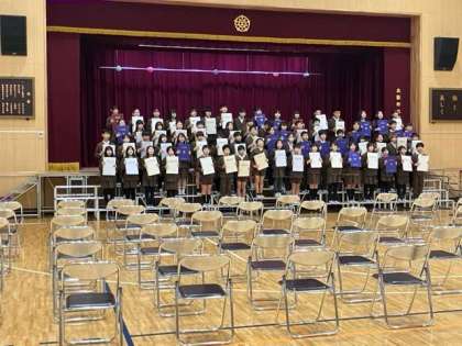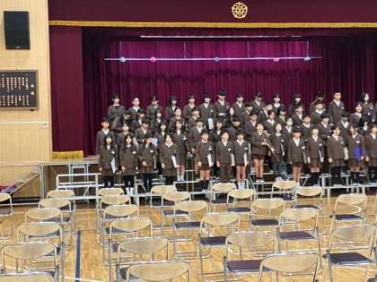 卒業式の練習で練習用証書ファイルを持ってよびかけを行っていました。証書ファイルを胸の前に出すタイミングを繰り返し練習してそろえていました。みんなで心を合わせて頑張ってくださいね。