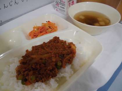 今日の給食は沖縄料理のタコライス、にんじんしりしり風でした。タコライスは不足しがちな鉄を摂取できるよう、豚レバーのチップを入れています。カレー粉を使用し、臭みをとることで違和感なく児童も食べていました。