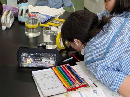 ビーカーに泳いでいるメダカを、虫眼鏡を使ってじっくりと観察しました。