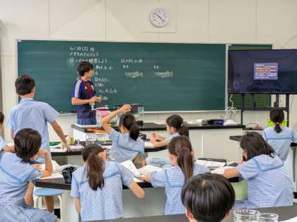 背ピレの切り込みや尻ビレの大きさから、メス、オスを見分けます。子どもたちはからだの特徴をとらえてメスとオスのちがいを見分けていました。