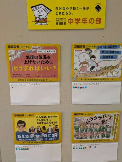 【課題図書の紹介】 公開日 2025/06/24 更新日 2025/06/24 お知らせ PTAや図書ボランティアの保護者の方が1階ロビーの展示スペースに、今年の課題図書の紹介ブースを作ってくださいました。気になる図書にはシールをはるシステムになっており、どの図書にみんなの関心が集まっているかすぐにわかります。 課題図書は図書室にあります。ぜひ読んで、書ける人は読書感想文にも挑戦してみてください。 いいね(0)
