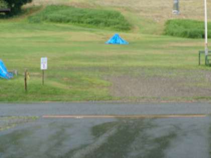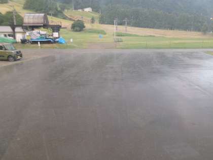 キャンプファイヤー会場の櫓はシートをかぶせられ、寂しげです。