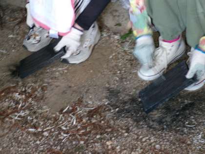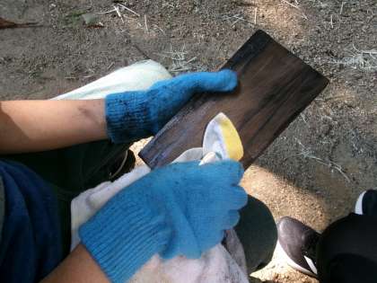 焼き板づくりでは、まずブラシやタオルで炭を落としてきれいにしました。