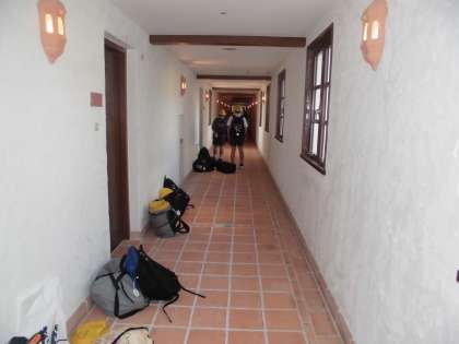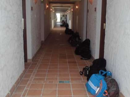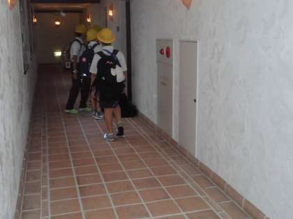 子どもたちは、6時に起床し荷物の整理をしました。整理後担任の先生にチェックをしてもらいました。これから朝食です。まずは食事係が食事の準備のために朝食場所に移動しました。