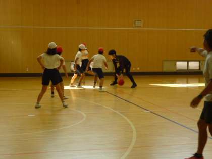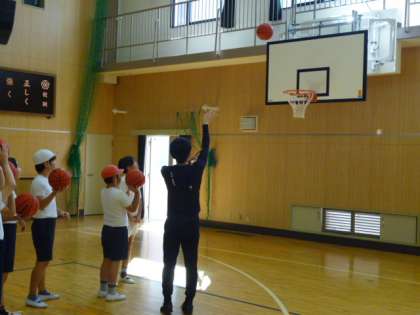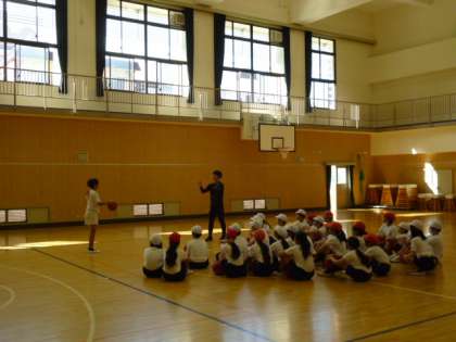 プロならではのテクニックを見せていただきながら、基本的な動き(パスの受け方、ドリブル・シュートの仕方)を学び、最後はコーチ・先生の連合チームとゲームをして、バスケットボールをプレイする楽しさをたくさん味わいました。
