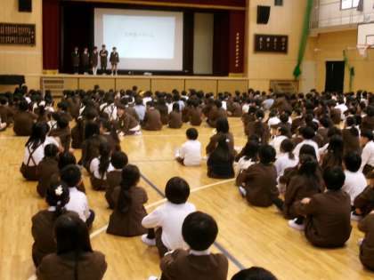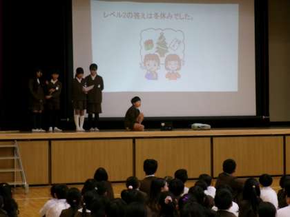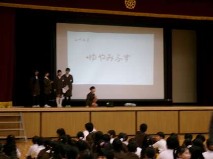 子どもたちはスクリーンに表示されたスライドの文字を見て、