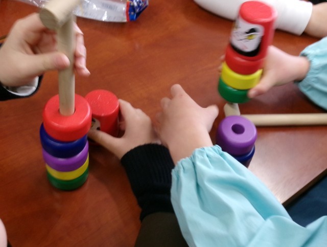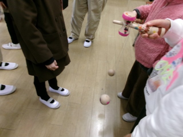 けん玉、こま回し、だるま落とし、お手玉の遊び方を教えてあげました。