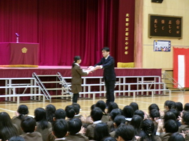 1年生と5年生の代表が、3学期に頑張ったことを発表しました。