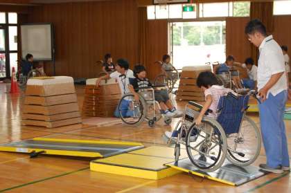 9月24日(水)大阪市立心身障がい者リハビリステーションのスタッフの方が、沢山の車いすを持ってきてくださって、4年生の体験講習会が行われました。最初に講堂で、車いすの構造や取扱い方の説明を聞いた後、一人ずつスロープや跳び箱の置かれたコースを通りました。その後、グループで協力して学校の廊下や運動場で、補助の仕方を体験しました。少しの段差でもあれば車いすが通りにくいことや、周りの人の支えや気遣いが大切なことを学びました。町の中でも、自分たちのできるサポートは何だろうかと考えるいい機会となりました。