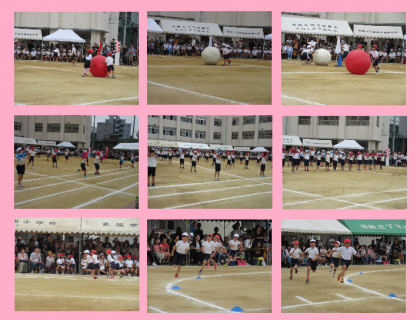 二人組で、大きな玉をころがします。うまく力をコントロールして、じょうずに旗をまわることができました。