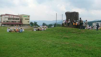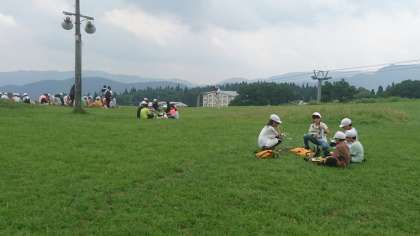お弁当タイムです。草の上に座れない子どもがいて、中腰で食べている子やら、モニュメントにお弁当を置いて、カウンターのように食べている子もいます。