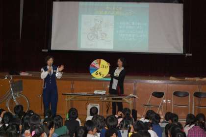 10月22日(水)港警察の交通課のお巡りさんと港区役所の担当者の方が、交通安全についてお話をしてくださいました。1.2年生には、特に交差点や信号で、安全を確認して通行するように話されました。5.6年生には、自転車ルールプックをもとに、気をつける点を分かりやすく教えてくださいました。自転車の事故は、自分が被害者になるだけでなく、加害者にもなる可能性があることが今よく言われていますので、子どもたちも真剣に指導を受けていました。3.4年生の実技講習は、お天気がよくなかったので、11月に延期しました。