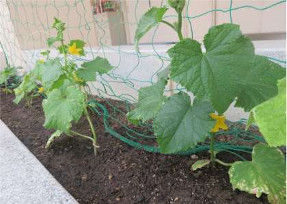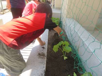 エンドウマメの収穫が終わり、みんなできゅうりの苗を植えました。
