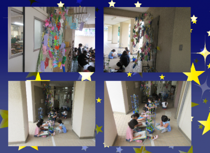 1年生の教室にも、七夕の笹飾りのような掲示物を子どもたちが作りました。