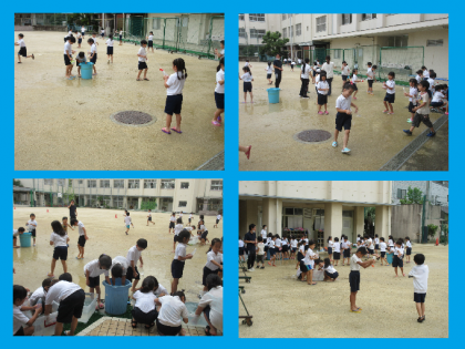 : 水着の上に体操服を着て、みんなで水の掛け合いをしました。