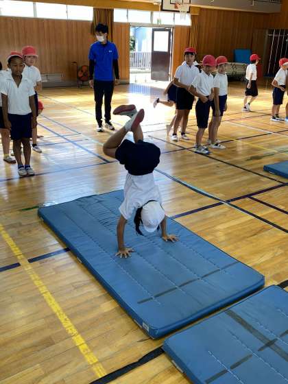 跳び箱運動の前に、感覚つくり運動をして両手をしっかりついて体を支えたり、腰を高く上げたりする感覚をつかみます。久しぶりのマットや跳び箱を使った運動なので、「腕に力が入らへん〜」と苦戦している人もいましたが、みな元気に一生けん命取り組んでいます。