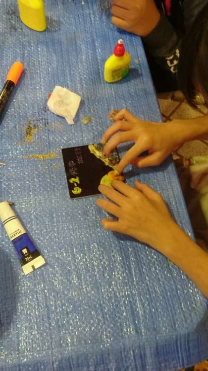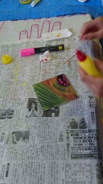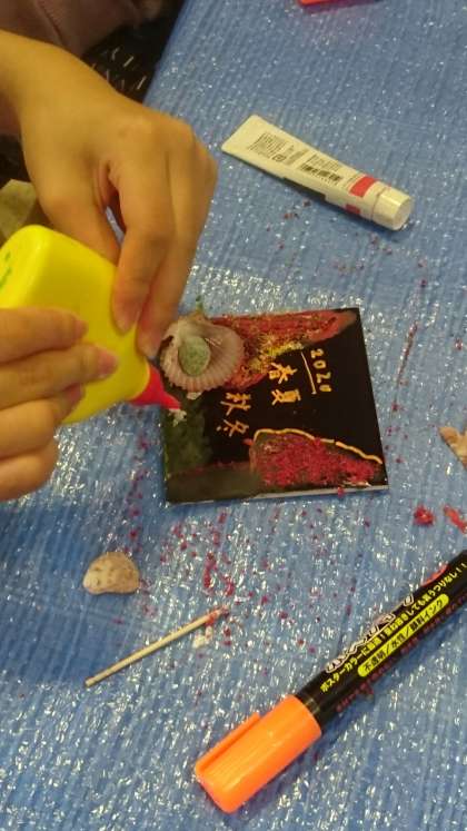 さあ、下絵ができました。どんどん砂や貝殻をつけていきましょう。