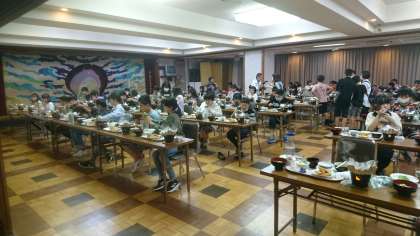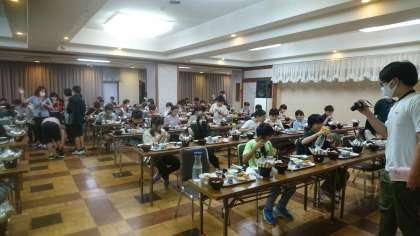 夕食の時間です。コロナ対策のため、全員同じ方向を向いて食べます。