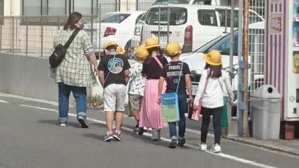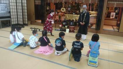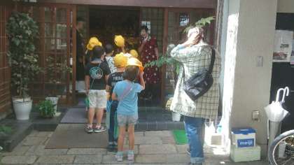 今日は、2年生が町たんけんをしています。西明寺に来ているグループは、ご住職のお話を聞いています。