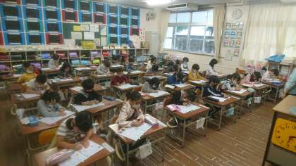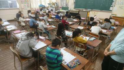まずは、1年1組です。真剣にカタカナの練習をしています。