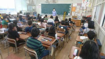 その前に、先生が大切なお話をしています。みんな、静かに聞いています。