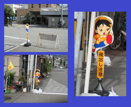 市岡地域のあちらこちらに「飛び出し注意」と書かれた、