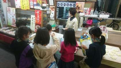 キッズマートに向けて、3年生が繁栄商店街のいろいろなお店について調べていますが、今日は、お店の方々にインタビューしています。