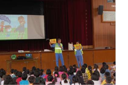 6月8日(月) 港区役所と港警察署の防犯の担当の方に来ていただいて、防犯教室を開きました。1年生は、安全に過ごすための5つの約束 ○一人で遊ばない ○ついて行かない ○連れて行かれそうな時大きな声を出す ○誰とどこで、いつ帰るを伝える ○大人の人に知らせる について教わりました。4年生は、万引きをしないことや自転車に鍵をかけることなどを、DVDを見ながら学びました。地域の中では、子ども110番の家や、青色パトロールカーの巡回が、みんなの安全・安心を見守ってくださっていることも、改めて学習しました。
