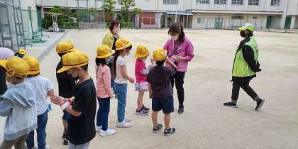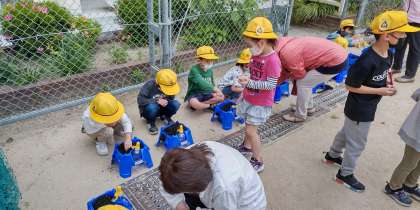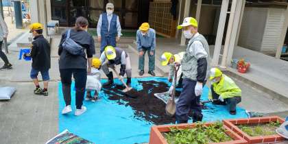 プランターに花の土を入れてもらいました。土に穴を開け、種をもらって植えました。