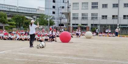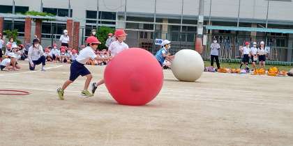 大きな玉を二人で力を合わせて転がしました。最後までがんばったね。