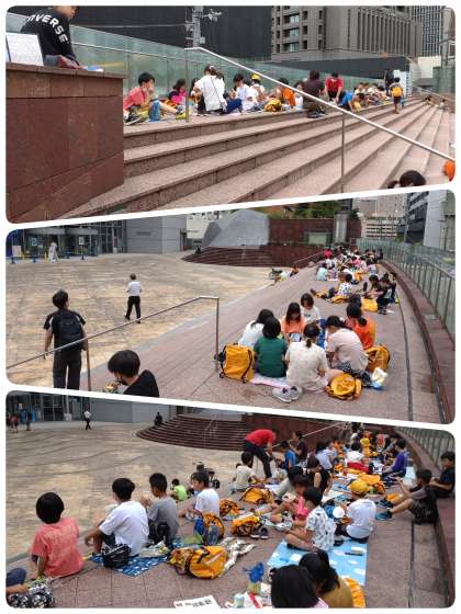 天気も程よい曇り空だったので、入り口前の広場でお弁当を食べました。