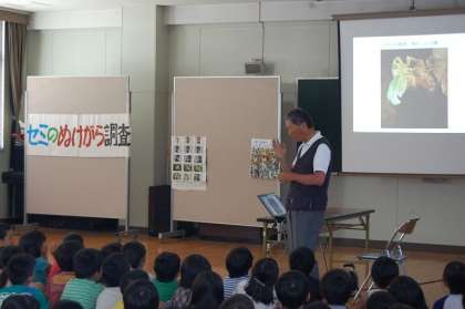 7月14日(火)蒸し暑い日が続きますが、セミの鳴き声が聞こえるようになりました。シニア自然大学校の皆さんをゲストティチャーにお招きして、3年生がセミの抜け殻調査を行いました。土・日曜日に近くの公園などで見つけてきたセミの抜け殻をテーブルに広げ、種類と雌雄の弁別を行いました。クマゼミには、お腹にでっばりがあって種類は簡単に分かりましたが、雌雄の区別はルーペを使って慎重に行いました。その結果、クマゼミの雄560匹、雌345匹で、アブラゼミとツクツクボウシが一匹ずついたことが分かりました。市岡の近くは、ほとんどクマゼミばかりでした。夏休みの自由課題で、他のセミのことも調べることができると楽しいですね。