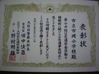 9月24日(火) 区民ホールで開催された「秋の全国交通安全運動港区民大会」において、市岡小学校が表彰されました。これは、いつも地域やPTAのみなさんが、子どもたちの登下校を見守ってくださっていることや、児童の安全教育を推進していることに対して、大阪府警本部長様より表彰を受けたものです。(本校では、6月にある「交通安全こども自転車大会」に毎年参加をしており、市内の中では常に上位の成績を修めています) これを機に、さらに安全教育を推進していきたいと思います。