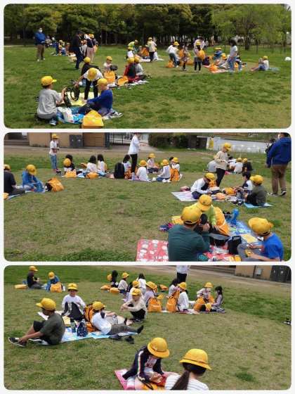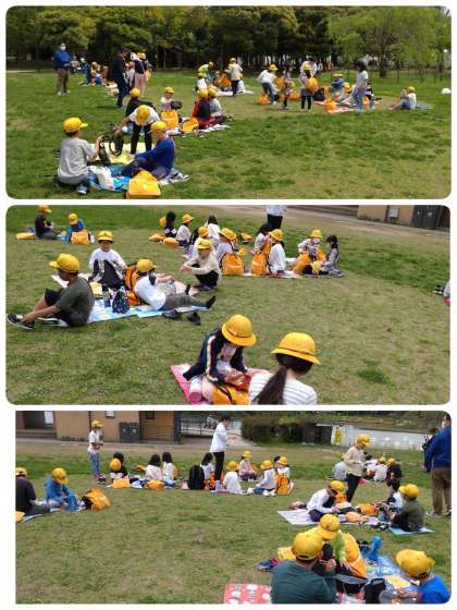 シートを敷いて子どもたちが楽しみにしているお弁当です。ともだちとなかよく食べています。青空の下で食べるお弁当は格別です。
