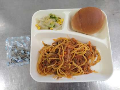 ・ミートソーススパゲッティ ・レタスとコーンのサラダ