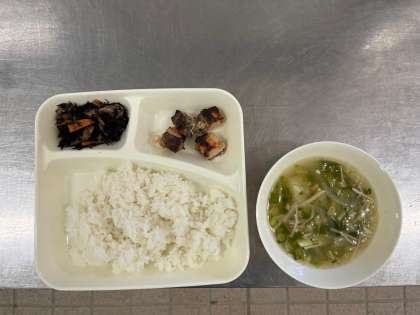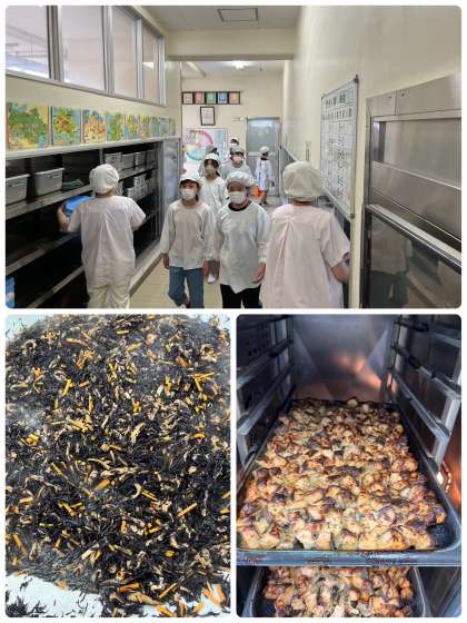 ひじきは大きな鍋でいため煮にします。さけのごまみそ焼きは写真のように焼物機で焼いています。