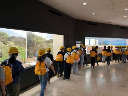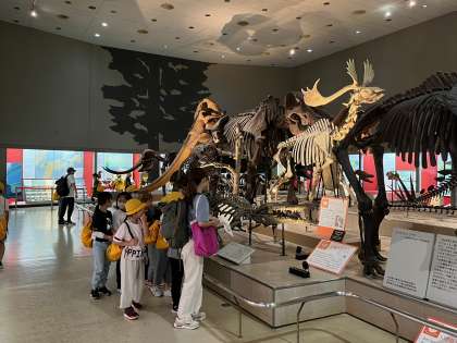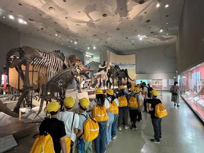 お弁当を食べた後は自然史博物館の見学を行いました。たくさんの学校が来館しているので、列のまま見学をしました。子どもたちはきちんと並んで見学できました。自然史博物館には様々な生物の標本や恐竜などの化石が展示されています。子どもたちは興味深く見ていました。