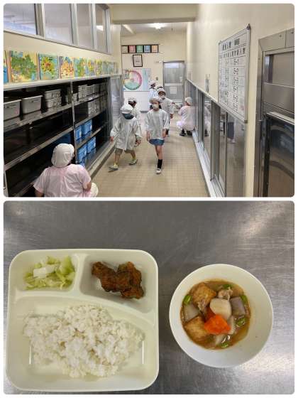 ちくわのいそべあげは写真にあるようにちくわ一つ一つにあおのりをまぶしたころもをつけ、給食室で揚げます。大変たくさんの数を揚げています。子どもたちが食べる時刻を考えて給食室で揚げているので、美味しくいただくことができます。