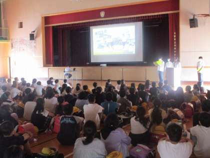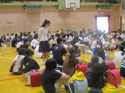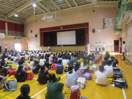 授業が終わったあとは、体育館で3校の6年生が合同で生徒会からの中学校の様子についてのプレゼンを聞きました。中学生の生徒会がしっかりしていることに子どもたちは驚いていました。小学生とは比べ物にならない自主性が伝わってきます。説明のあと、本校の6年生が先頭を切って挙手をし、質問を述べることができていました。大変勇気がいりますが、よくがんばって発言できました。素晴らしいことです。