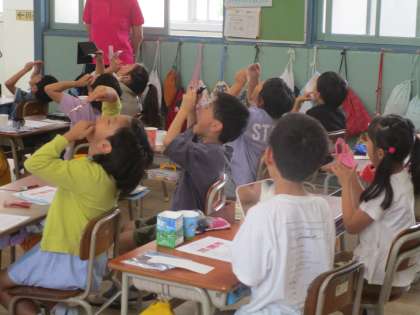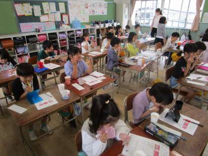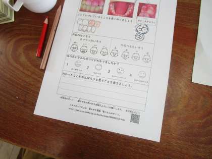 2年生は昨日、歯磨き指導がありました。大阪市教育委員会から歯科衛生士の派遣があり、指導していただきます。歯垢の磨き残しがわかるように染め出しを行い、歯を磨き、歯に着いた色を落としていきます。子どもたちは前歯や奥歯(第一大臼歯)を磨く方向などを教えていただき、実際に磨く練習を行いました。