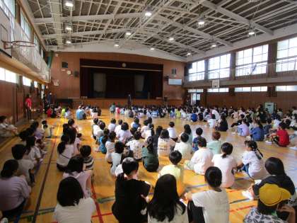 朝は日差しが強かったので講堂で児童朝会を行いました。子どもたちはしっかり話を聞くことができていました。